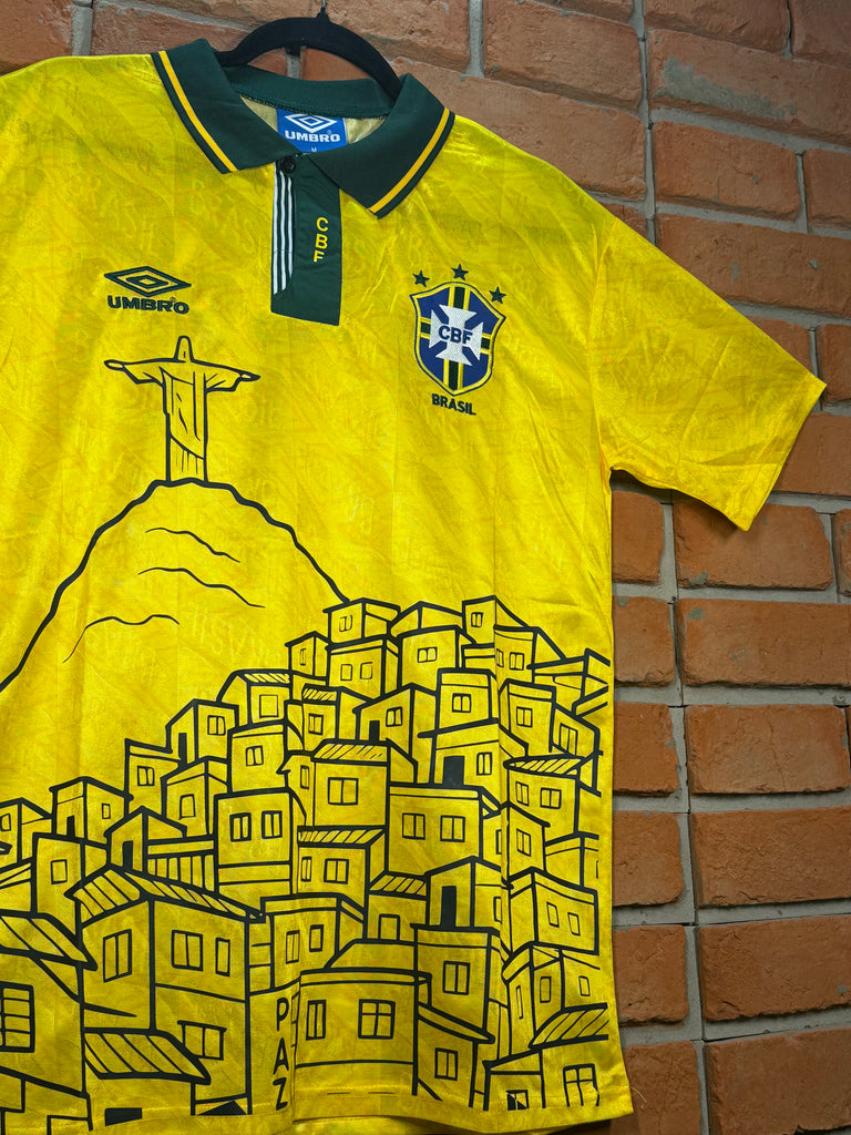 AA classic Brazil ’93-inspired shirt with a bold twist. Yellow base, green polo collar, Umbro logo and CBF crest for that true retro vibe. The highlight is the “Da Favela” artwork on the front, featuring the Christ the Redeemer and favela houses, celebrating street culture, roots, and real Brazil. Vintage football style with attitude. 🇧🇷🔥